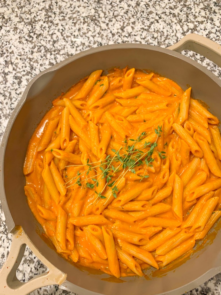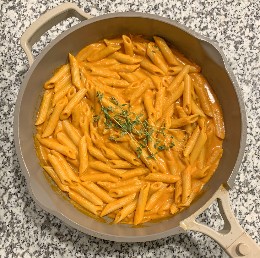 10. Add the cooked penne to the saucepan and combine until the pasta is evenly coated in the sauce.